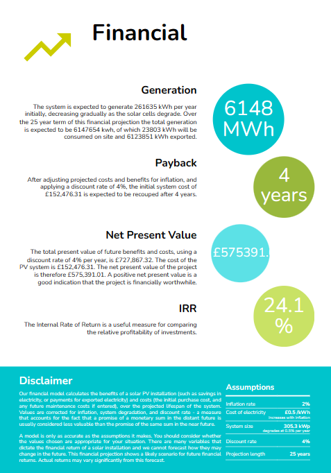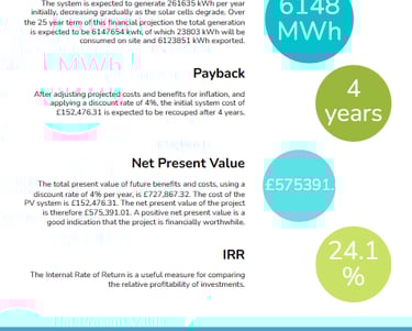 After investing £152,000 in a 710-panel solar system, the payback period is projected to be 4 years. This means that the initial expense will be fully recovered in that time frame. Looking ahead, the expected future benefit of this system is estimated to be £575,000. The solar system not only proves to be an efficient and sustainable choice, but it also presents a significant financial gain in the long run. By harnessing the power of the sun, this eco-friendly investment not only benefits the environment but also provides a substantial return on investment. With a payback period of only 4 years and a future benefit of £575,000, this solar system is a smart choice for those looking to make a positive impact while also reaping financial rewards.